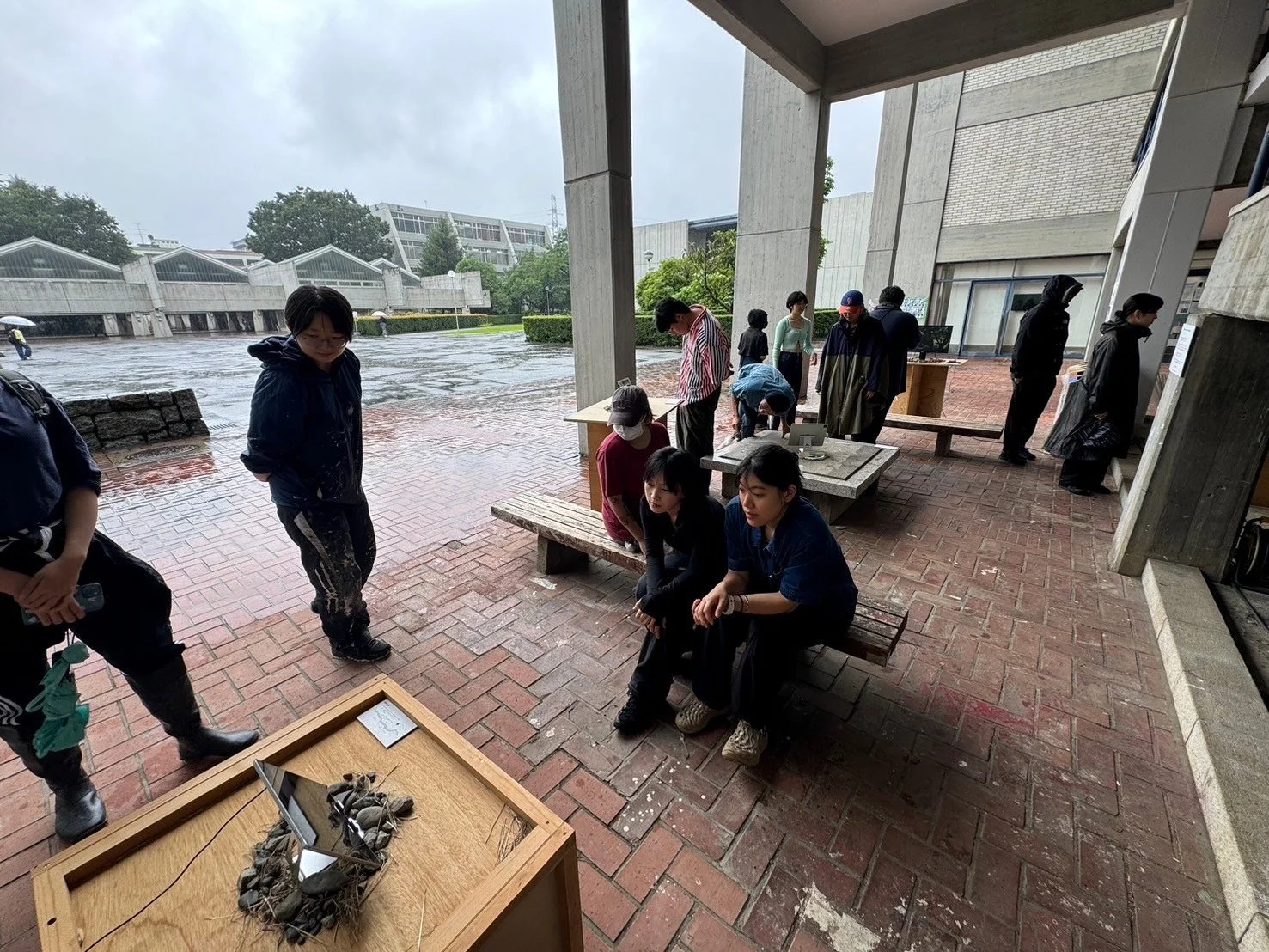 国分寺崖線に沿う4箇所で「餃子を作ってシェアする」ということを行い、それを撮影した。そしてこれらの映像を、ムサビの7号館下のスペースに設置した4台のモニターに流した。更に、もう一台モニターを置き、この空間の裏でわたしが餃子を作っている様子をライブ配した。5台のモニターの映像は同時に流れているため、一つがライブ配であることには気が付きません。しかし、映像に映っている餃子が焼けるのと同時に、この空間に焼き餃子の匂いが広がってくる。映像を観ている人が「どこからこの匂いがしているのだろう」と思った時、画面の中でも餃子が出来上がった。そして私は出来上がった餃子を裏からこの空間に持っていき、来場者と餃子をシェアする。皆で食べたり、しゃべったりしながら、映像の中とこの場所で同じようなことが起きていることを体験できる新しい作品。